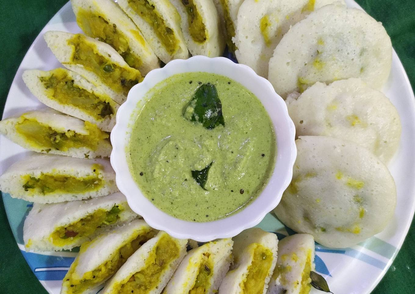 Recipe of Homemade Stuffed Idli with coconut mint Chutney