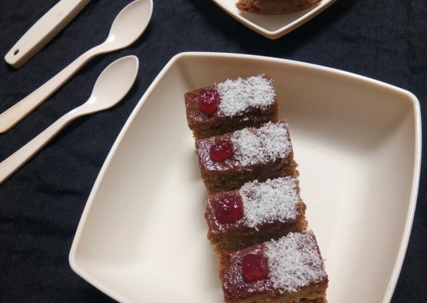 - Now cut cake in pieces of baars and garnish with dessicated coconut and mix fruit jam.