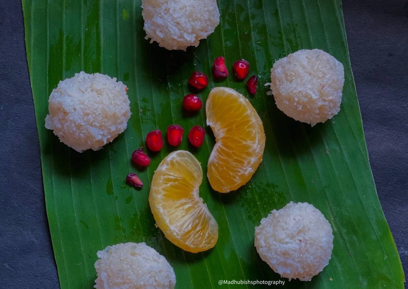 - Plate to enjoy a juicy inside Narkel Naru or Coconut Ladoo.