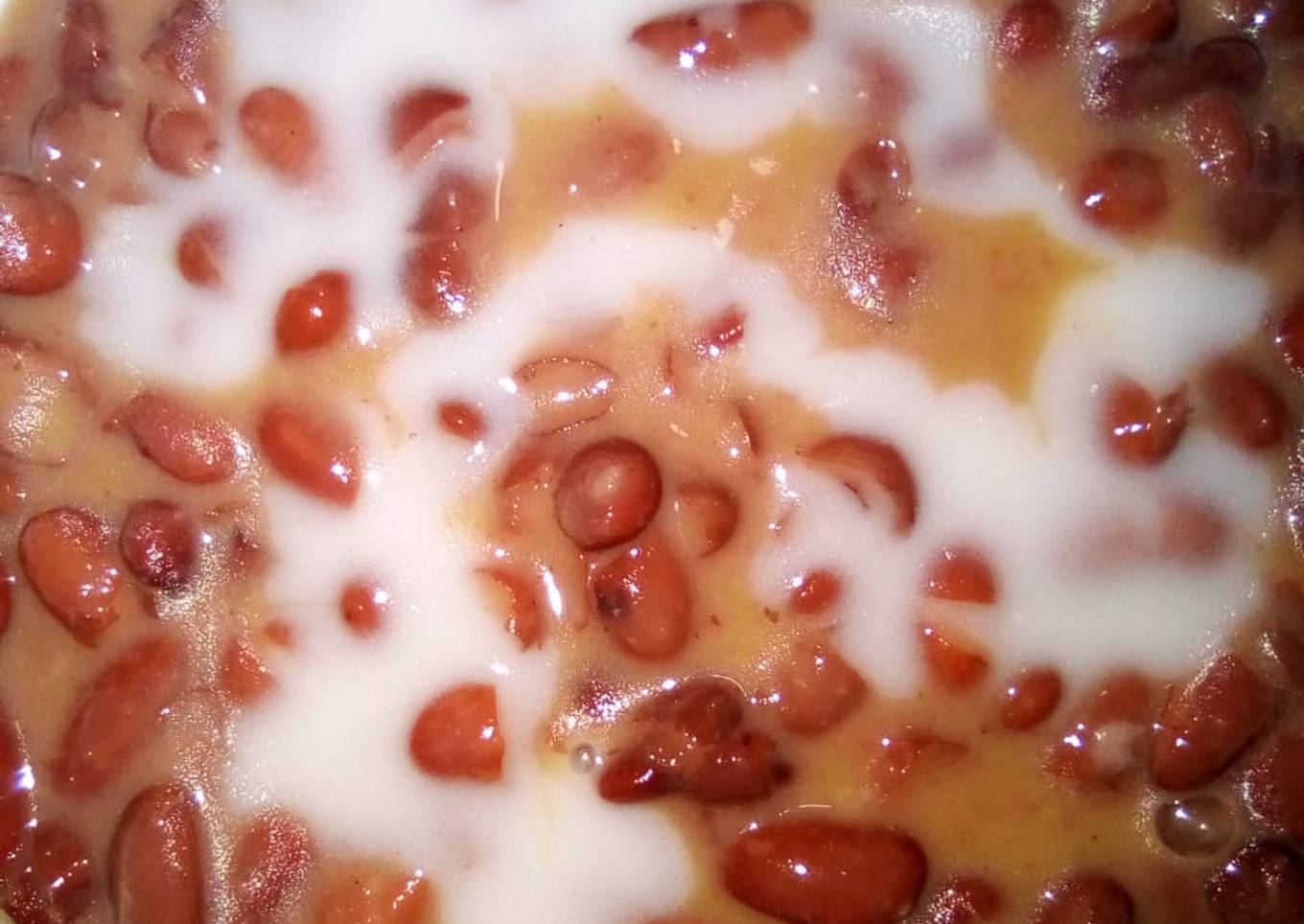 - In a sufuria add the beans, salt, onions and light coconut milk. Allow to simmer, stirring occasionally until almost all the liquid has been absorbed