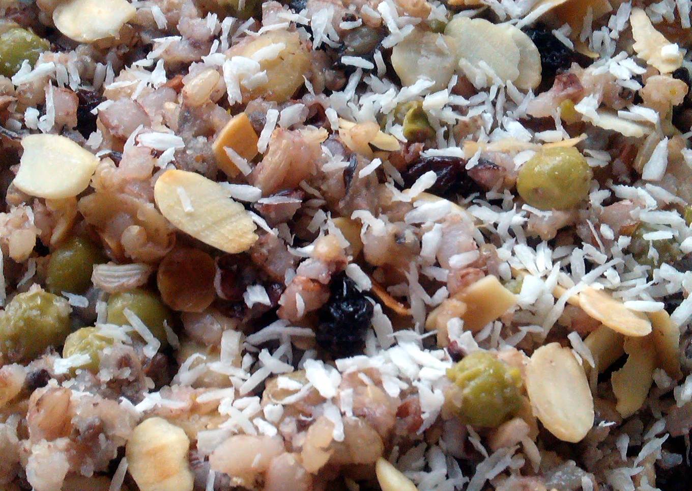 - Top with the dessicated coconut and reserved toasted almonds