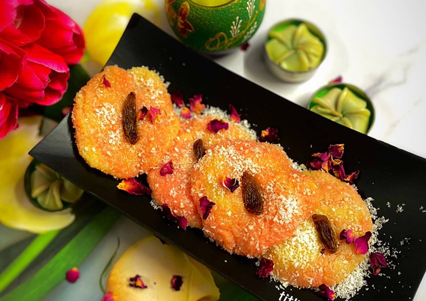 - Now make flat balls and coat again with some dessicated coconut and sprinkle some rose petals and place a raisin on each burfi and chill before serving