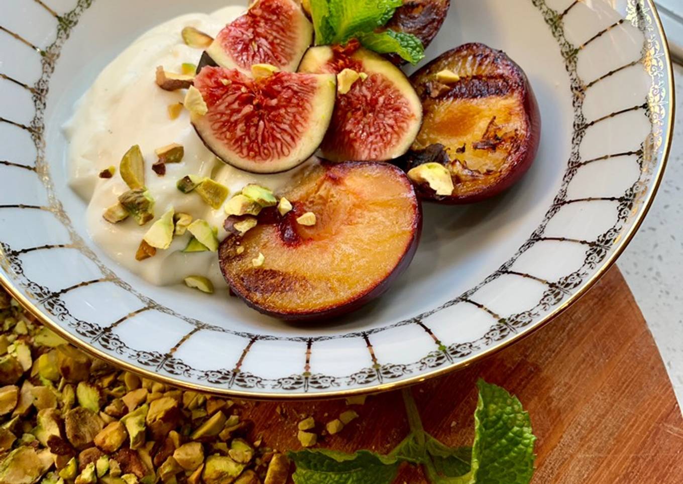 - Put yoghurt in bowl then plums on top. And decorate with Figs and pistachio nuts.