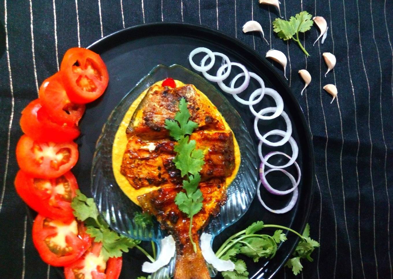 - Pour the mustard coconut sauce on a serving plate & then place the grilled pomfret fish over it.