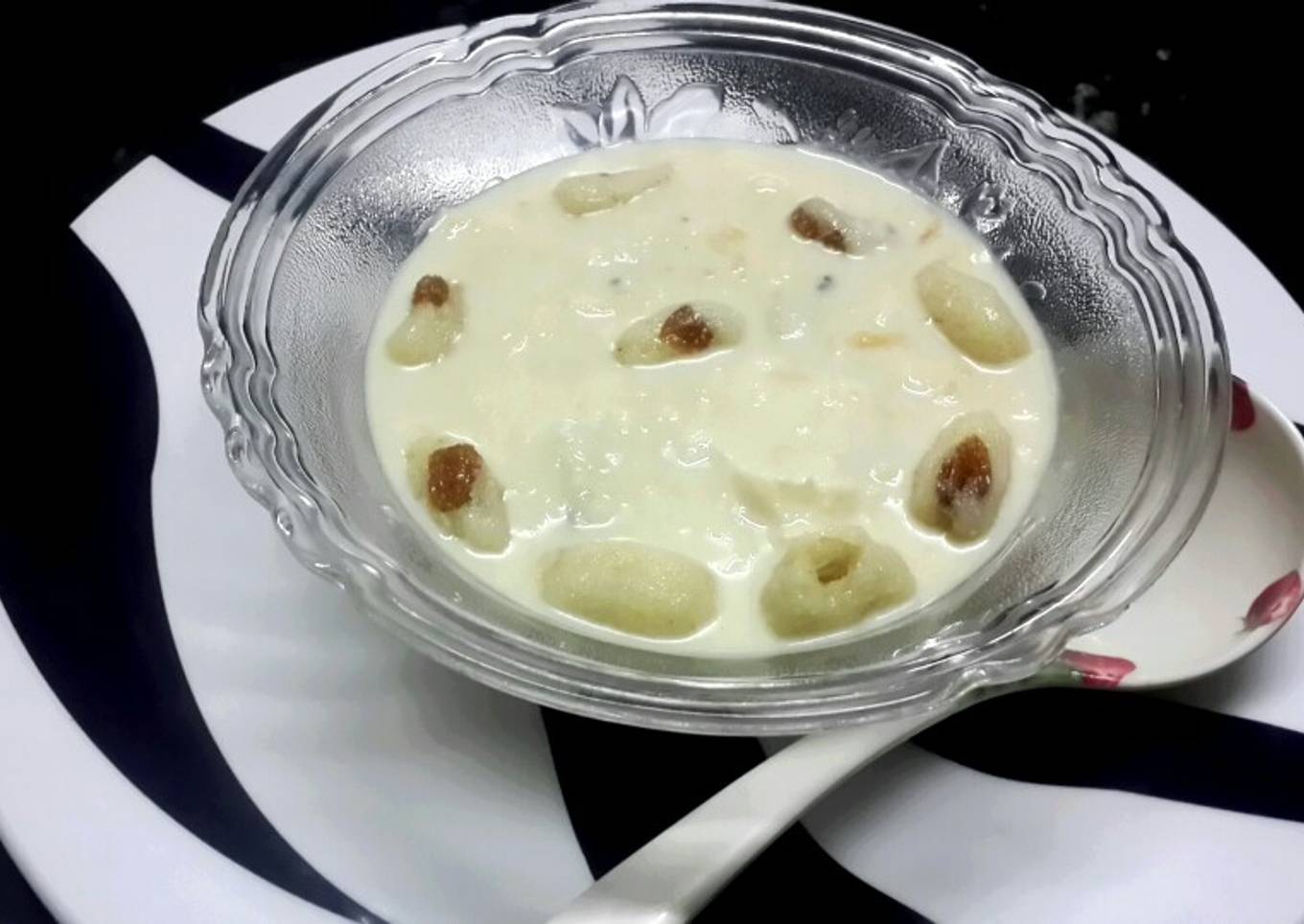This is a delicious sweet made with rava/semolina and scraped coconut dumplings which are dunked in a bed of sweet kheer (condensed milk).This dessert is made during any religious festival and specially during the harvest season in winter when it is made with date palm jaggery.At other times it is made with sugar or date palm sugar ( michri ).