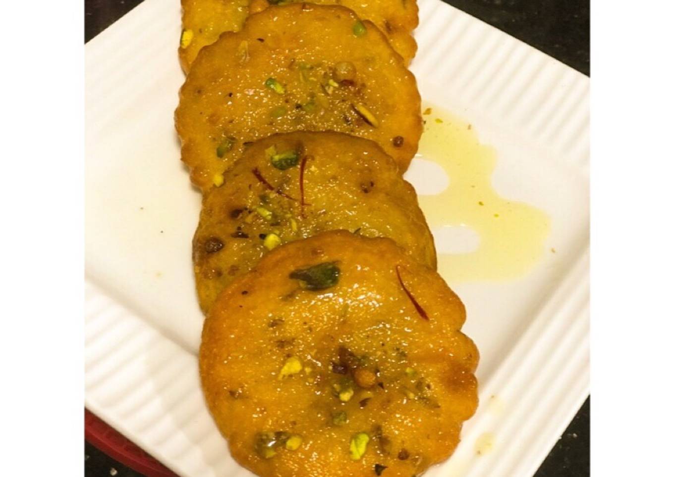 - Once, the Malpuas are fried- Strain it well & directly put them into the warm sugar syrup (Ensure, the syrup needn’t be hot but just warm because, the Malpuas are absolutely hot), this way it’d drink sufficient syrup- We need to take it out within a couple of mins time post adding them into the syrup else, they might be extremely soft & break or tend to be kinda mushy