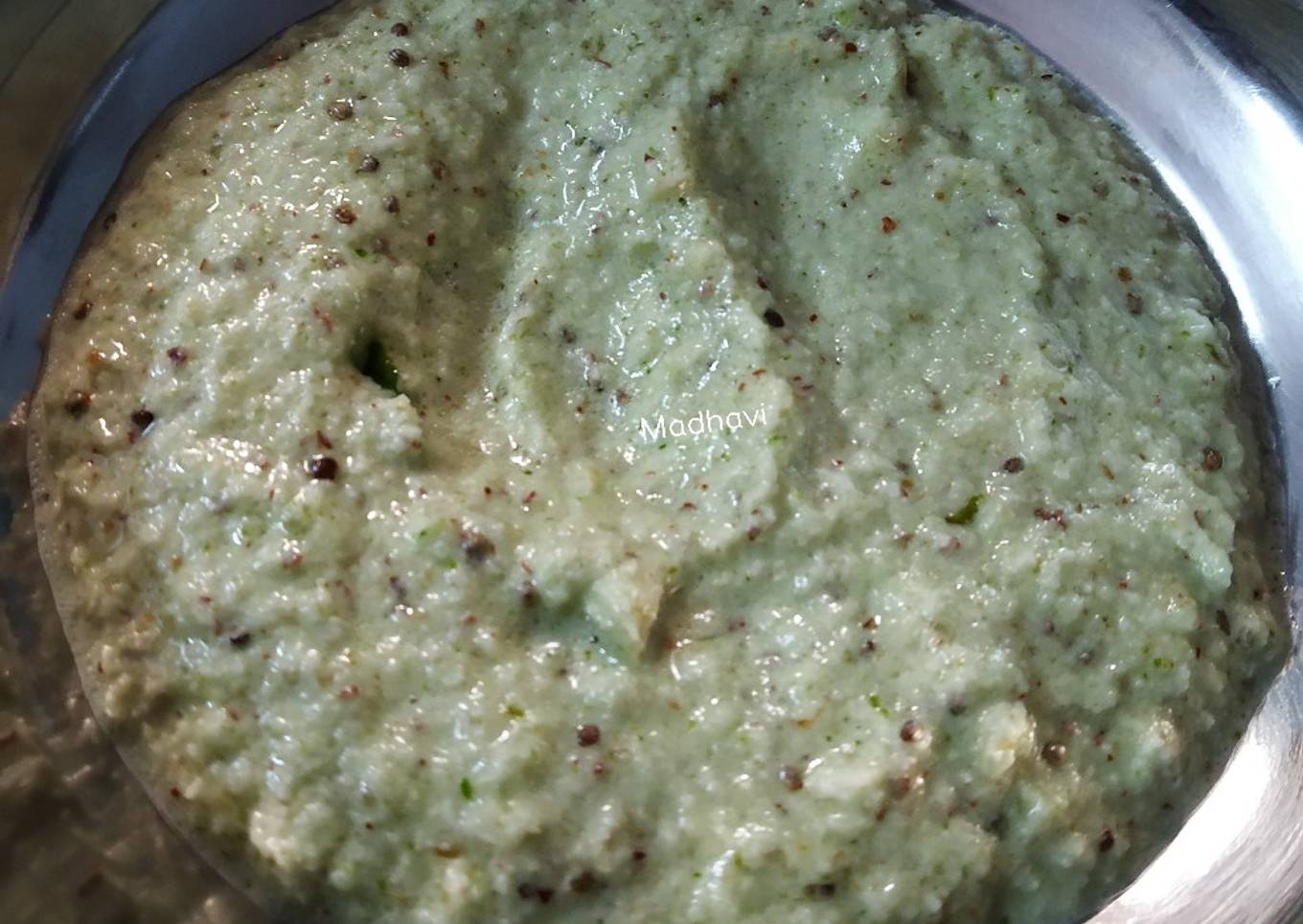- Take a blender, add freshly grated coconut, cumin seeds, garlic, chopped raw mango pieces,green chillies, coriander leaves, salt, and some amount of water and blend to smooth paste.(add water according to your consistency needed thick or medium thin)