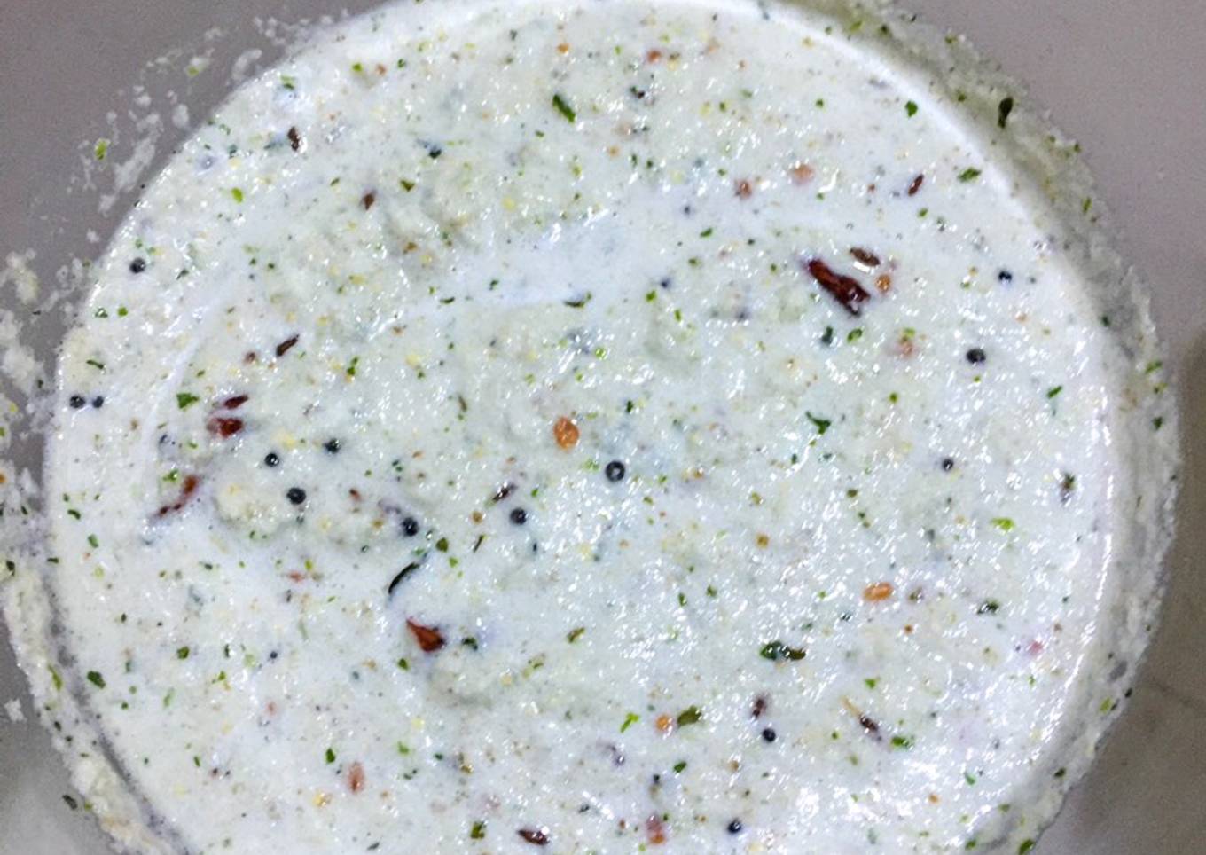 - When the curry leaves turn crisp, add hing and pour this over the coconut chutney & serve.