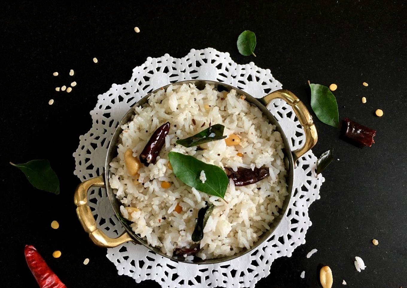 A simple, delicious and comforting bowl of rice flavored with fresh coconut and simple spices. Pair it with some raita, curry or just some Indian pickles/papad for a south Indian treat.