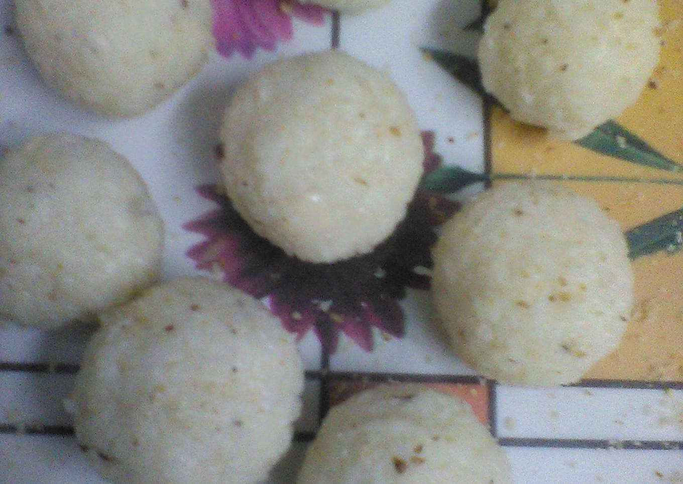 Coconut is a very tasty fruit.we can make much more recipes.laddu is a sweet dish which i made by coconut without heat.only use my head and brain.this sweet make by milkmade or sugar. But i use another thing.