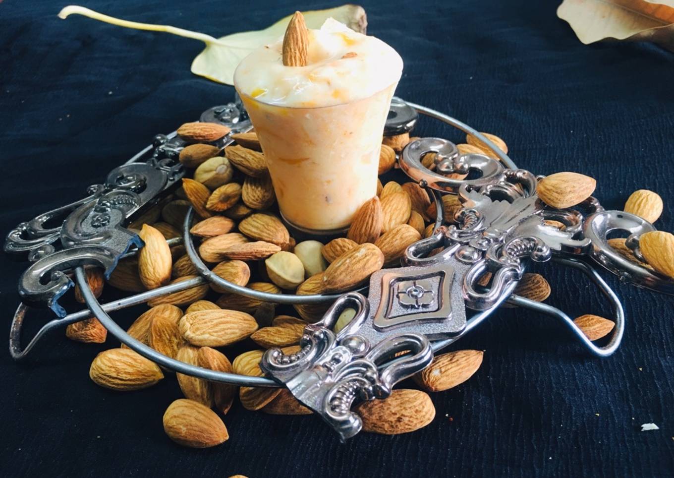 - In a glass add a layer of yoghurt then add layer of coconut crush and then crushed mango and repeat the process. Garnish with almonds.