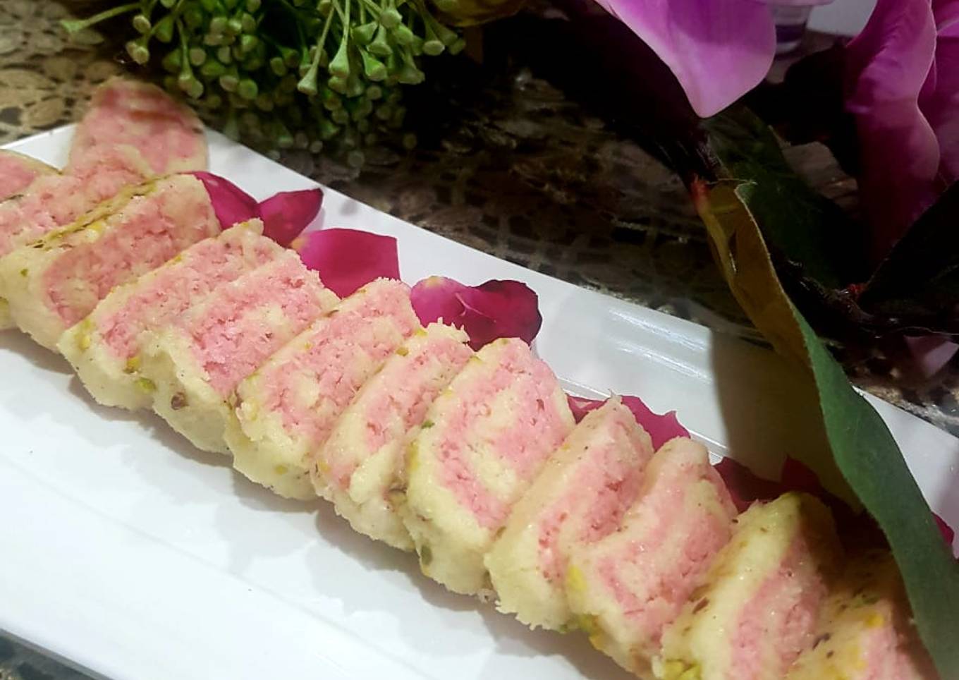 - Divide into two equal parts, add pink food colour in one part and mix well. Place aluminium foil, grease with ghee, flatten the dough in Rectangular shape, keep aside. Grease another aluminium foil with ghee. Flatten the dough in Rectangular shape.