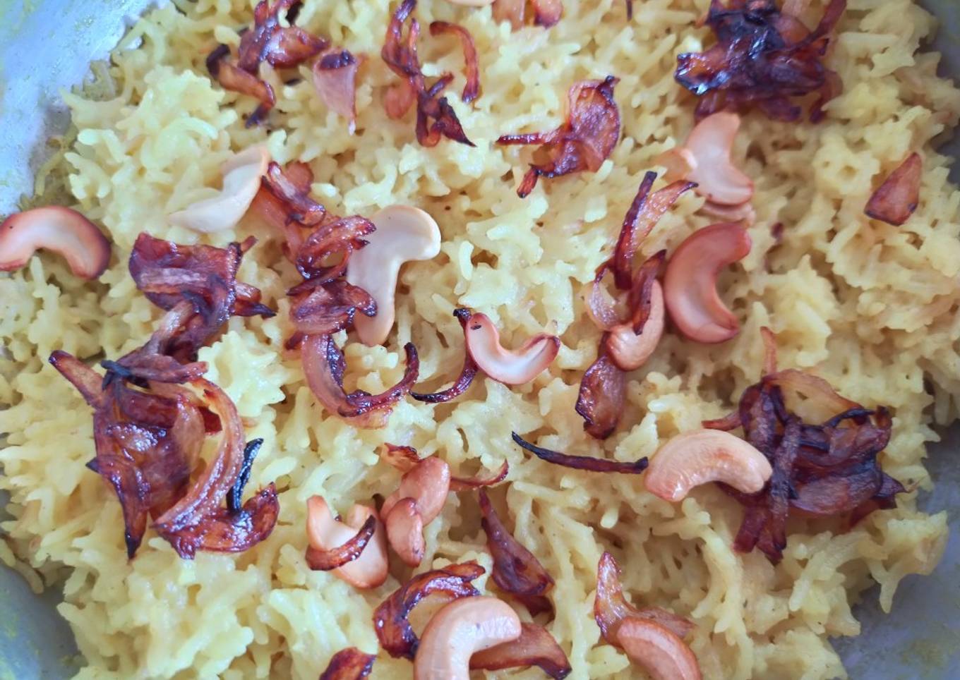 - Cook it on low flame for another 10 to 15 minutes. Garnish with fried onion and cashew. Serve with onion raita.